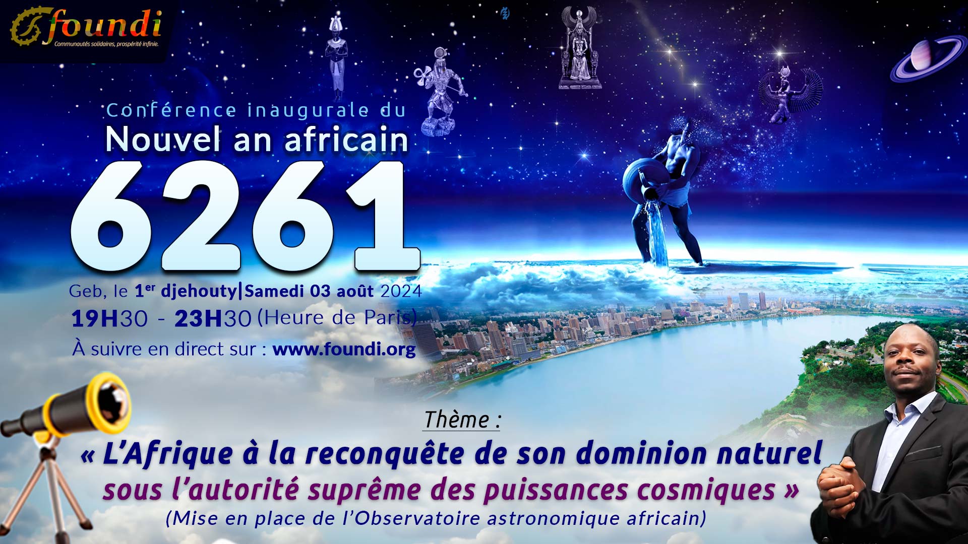 La Fédération Foundi®, en partenariat avec Akwaba!® Re-évolution Ubuntu pour l'Afrique africaine, a le plaisir d’annoncer la tenue de sa conférence inaugurale du nouvel an kamit 6261, ce samedi 03 août 2024, à partir de 19H30.